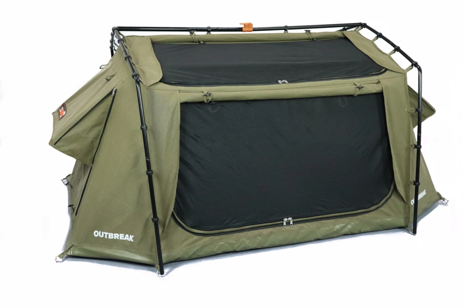 Convenient 4-way entry with zippered mesh screens to keeps the bugs out combined with panoramic 360 degree views and unique twin stargazing roof windows, fantastic cross flow ventilation is achieved. The Outbreak is fitted with full zip down storm covers and large all weather gusseted window awnings at each end to ensure the Outbreak keeps you dry in wet conditions. The gusseted window awnings at each end allow for controlled airflow in wet conditions reducing condensation within the swag. A tropical fly is also included although using it is optional.