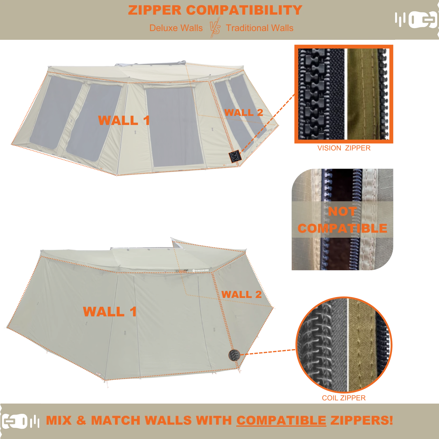 Providing the same generous usable space as the standard wall kit, the Deluxe Wall kit also allows for controlled filtered light with zippered screened panels.