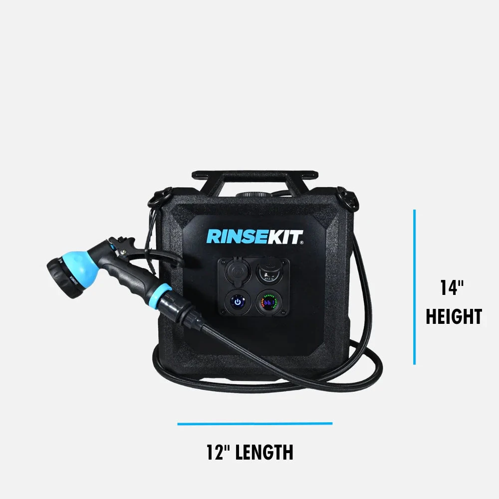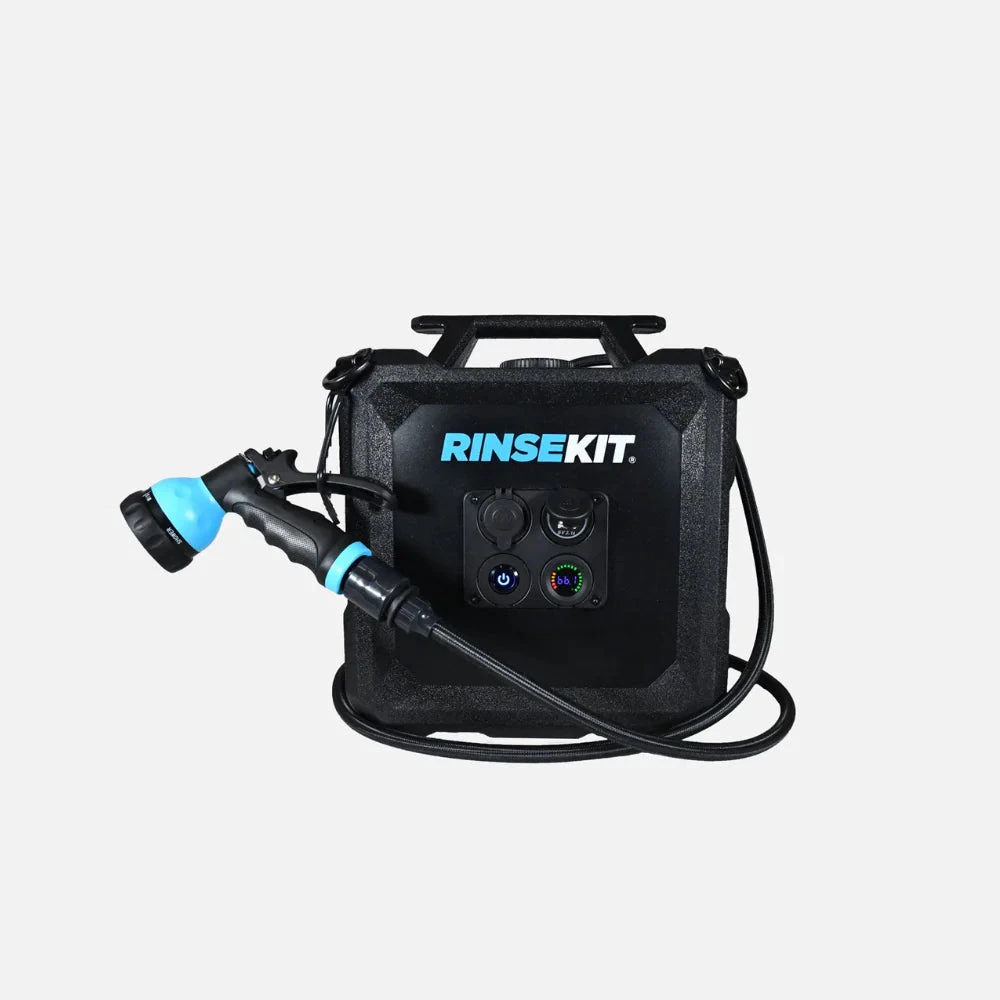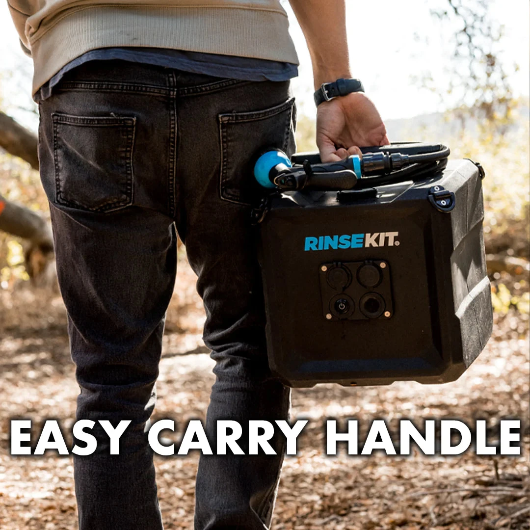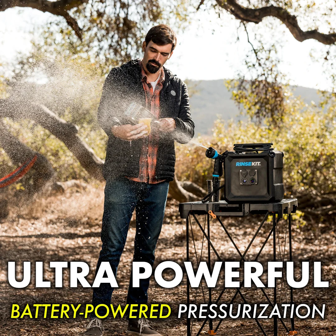 The RinseKit Cube, is our 4-gallon portable shower that empowers you to clean up wherever adventure takes you. Equipped with battery-powered pressurization, the Cube boasts a consistent high-pressure spray that can blast off the toughest dirt and grime. It’s super easy to use – simply pour in water, press the power button and spray. It is built tough with military-grade materials, and is equipped with stainless steel tie-downs for when the road gets rough. The Cube is the strongest, most durable, and intuitive portable shower on the market – made for keeping you clean no matter how far out you go.