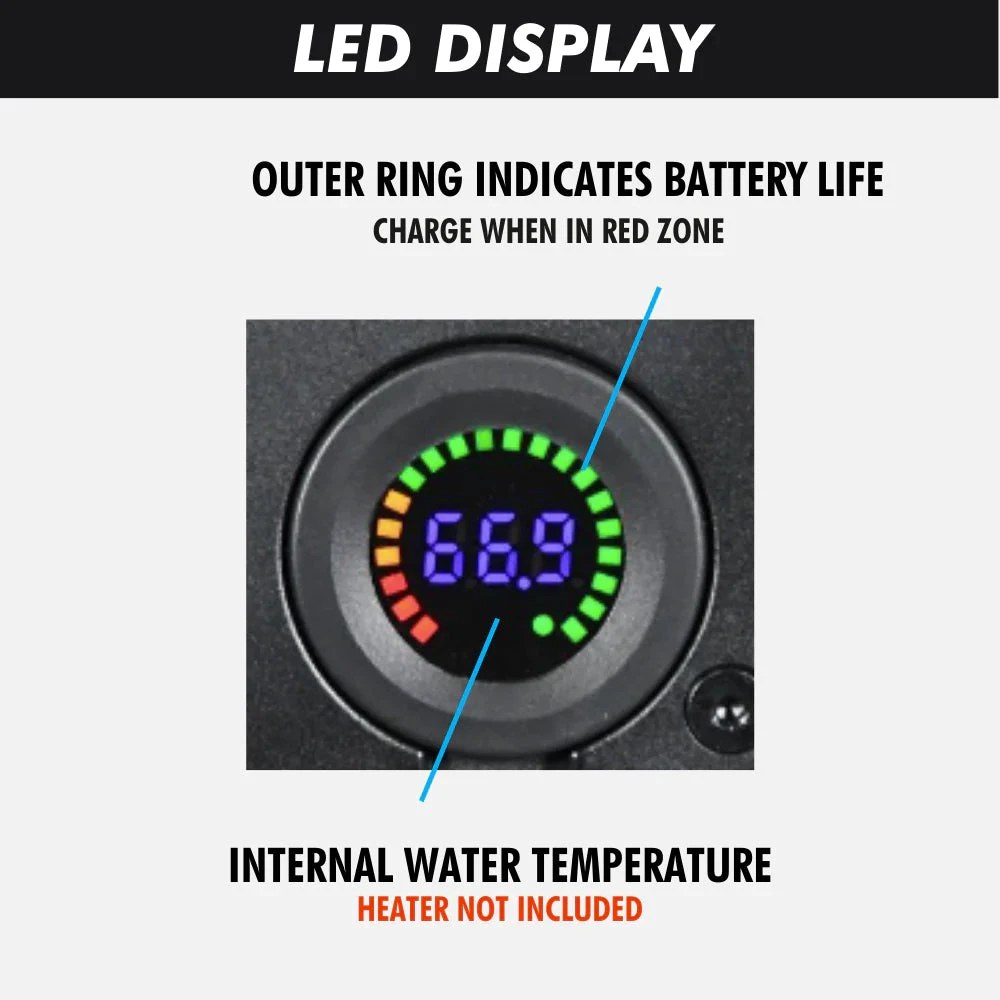 • High-Tech IP65 Waterproof Control Panel – Waterproof & resistant to the elements displays internal water temperature & battery life
