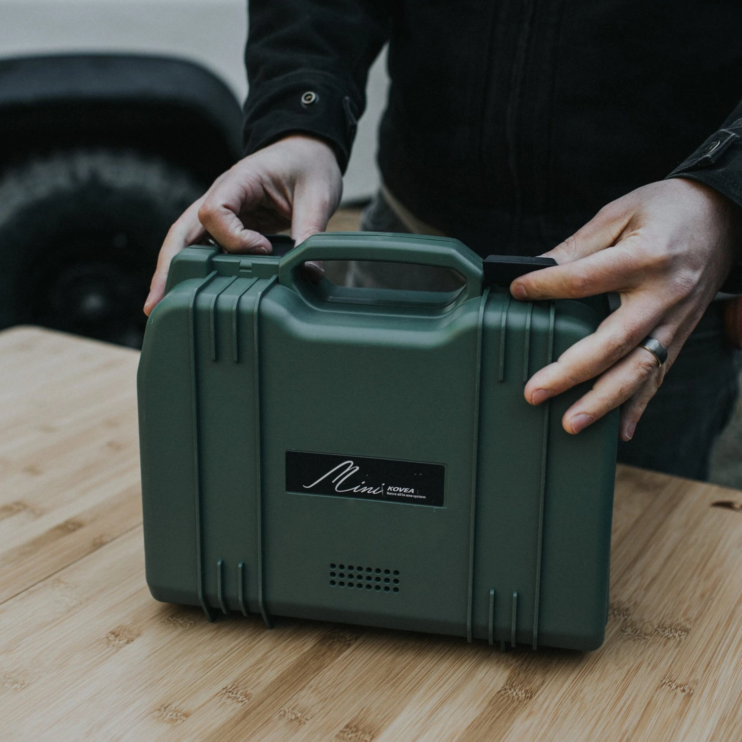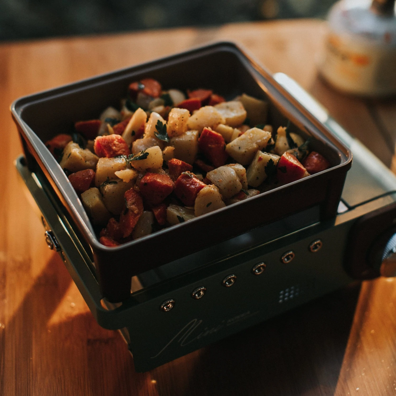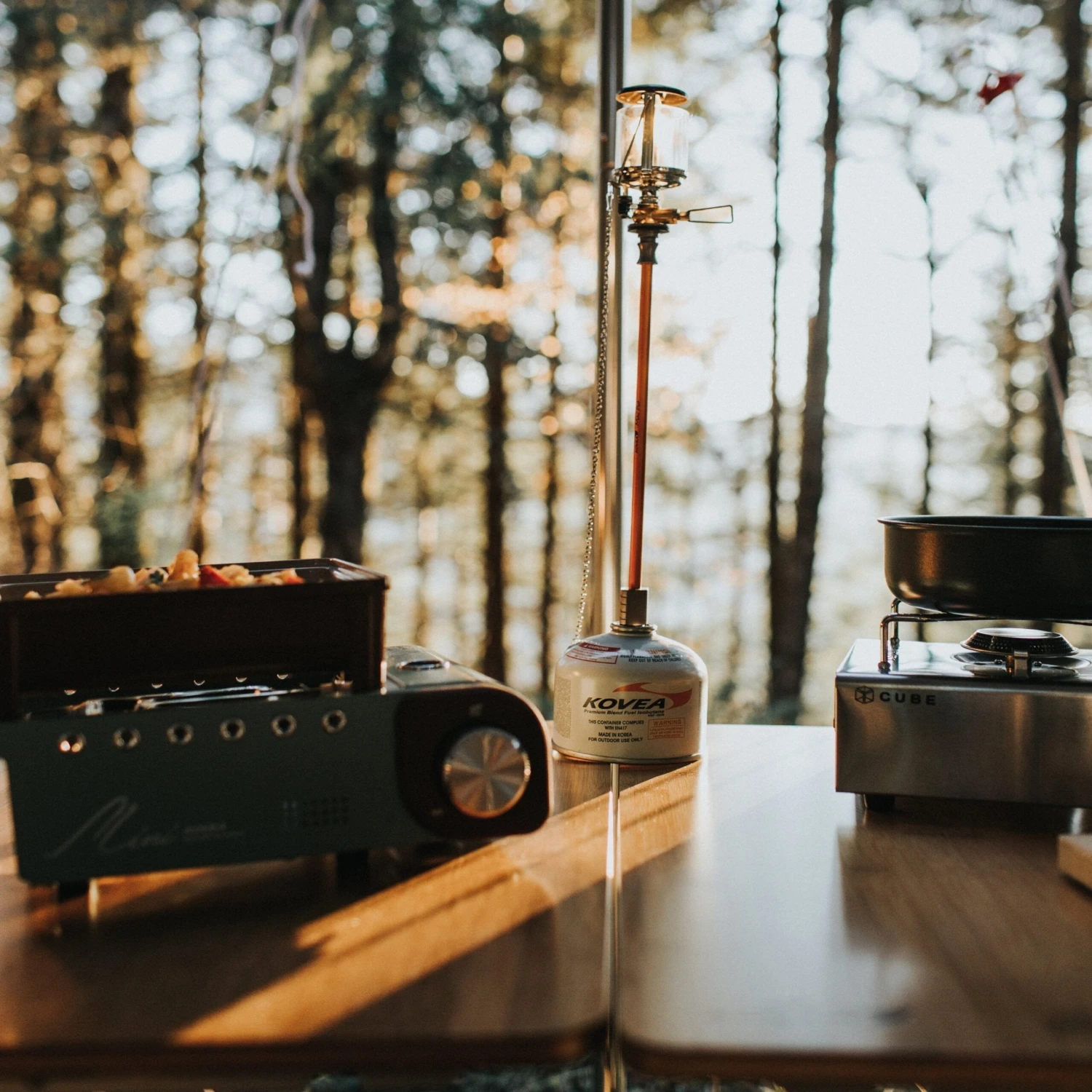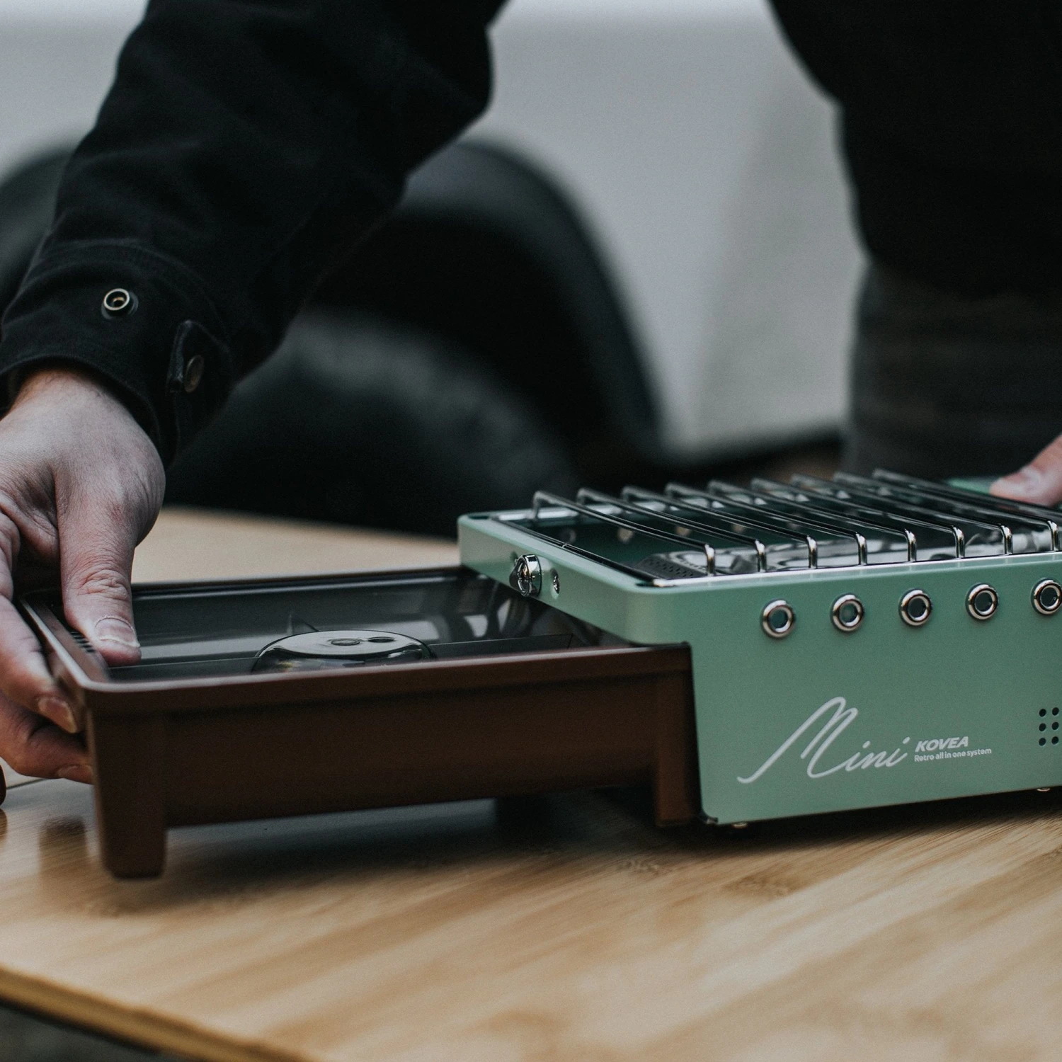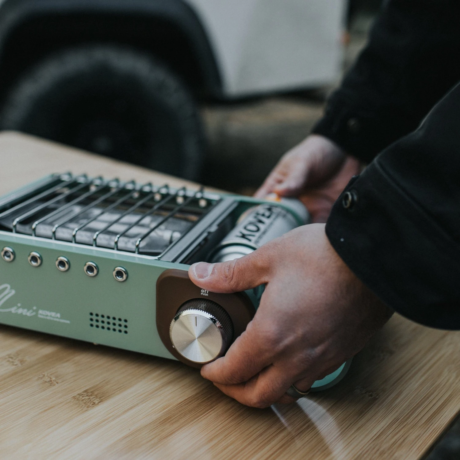This is the Kovea All In One Mini. It comes with everything packed into a sturdy hard case. The ceramic coated cast iron pan stows under the burner for transport and the removable pot support provides for easy cleaning. It’s extremely versatile, compact, and in Seafoam Green and Milk Chocolate Brown it’s stunningly stylish and perfect for cooking great meals while Overlanding.
