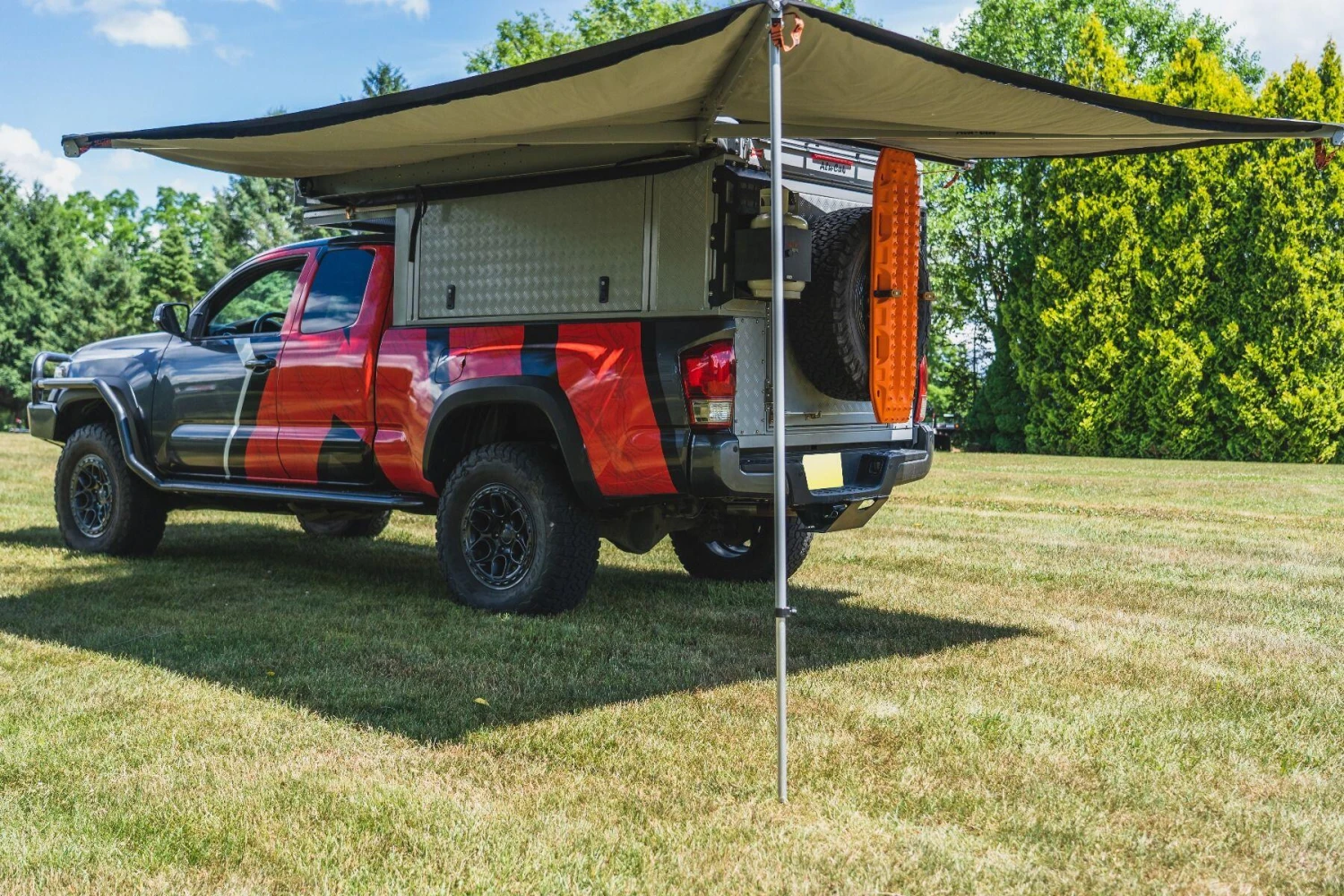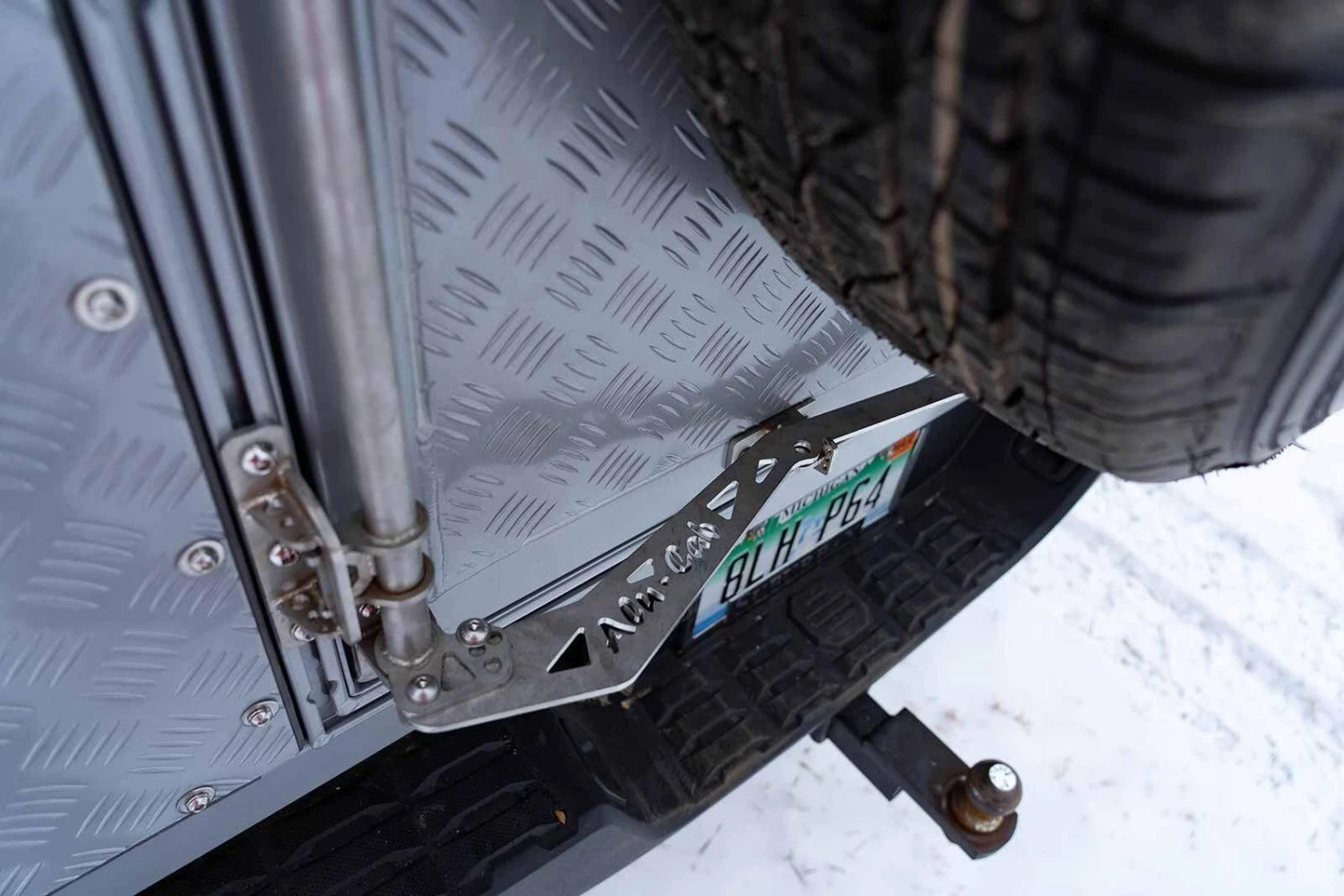 - An easy-access vertical door with heavy-duty hinges, and the ability to mount a 33″ spare wheel on the back with the addition of the Spare Wheel Bracket. This rear door design eliminates dust and water intrusion commonly found with other canopy style campers.