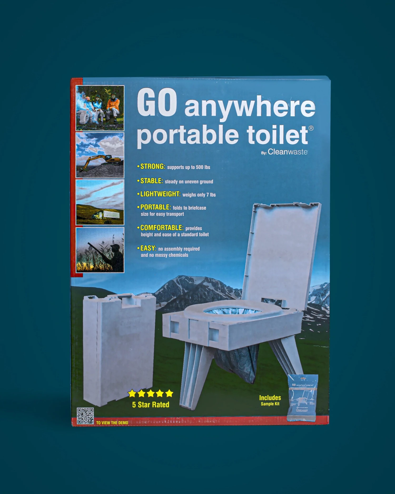 Enjoy dignified convenience with our safe, sturdy, thoughtfully engineered, premium quality GO Anywhere Portable Toilet®. Our compact toilet weighs just 7 pounds and folds closed to standard briefcase size. It provides the comfort, height and ease of use of a standard toilet, supports up to 500 pounds and is stable on uneven ground. No mixing, messy chemical waste storage tanks or dump stations required. No assembly required. Use it, seal it, and toss it in the trash.