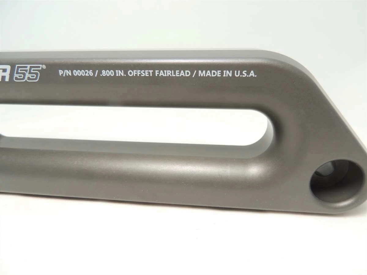 Factor 55 introduces a new Aluminum Hawse Offset Fairlead. These 1.5″ fairleads are CNC machined from 1.5 inch thick USA 6000 series aluminum bar. The industry standard fairlead thickness is .75 inches thick. The thicker aluminum bar results in a larger outer fillet radius for the synthetic rope to slide against. This results in less stress on the rope fibers during high angular pulls, increasing the life of your synthetic rope. The Offset fairleads are the industry’s first Hawse Offset fairlead compatible with larger ½ inch diameter rope tube thimbles. The rope slot height opening is taller to allow the larger ½” tube thimbles to pass through. There is also a machined outer corner chamfer to reduce rope stress for those than plan on using the winch as a front suspension “suck down” device. These fairleads come in a durable MIL-A-8625F TYPE III gun metal gray hard anodized finish with a laser engraved logo. What is the best surface finish for Hawse aluminum fairleads? Without a doubt it is a Type III hard anodized coating. Not cosmetic Type II anodized finishes, not powder coated, and not raw or polished aluminum. Why? Because a hard coating can resist the abrasion damage from a dirty/gritty synthetic winch rope rubbing across it. Especially during extreme side pulls where rope fiber stresses are extremely high. A Mil-A-8625 Type III hard anodized finish leaves a .002” thick Al2O3 ceramic coating that is in the top 5 hardest materials known to mankind (See chart under Corundum/Sapphire). Not too far away from diamond hardness actually. Another valuable material property from hard anodized coatings are the low coefficients of friction. Low friction = lower rope heat. Only drawback? Hard anodizing is not offered in typical bright and fancy anodized colors. All Factor 55 fairleads only come in Mil-A-8625 hard gray finishes. Not fancy, but it is the proper finish to extend the life of your synthetic rope. Overall Dimension: 11.75″ x 3.4″ Offset Opening: .80″ Thickness: 1.5″ Standard 10″ Bolt Mount Spacing For synthetic winch rope only.