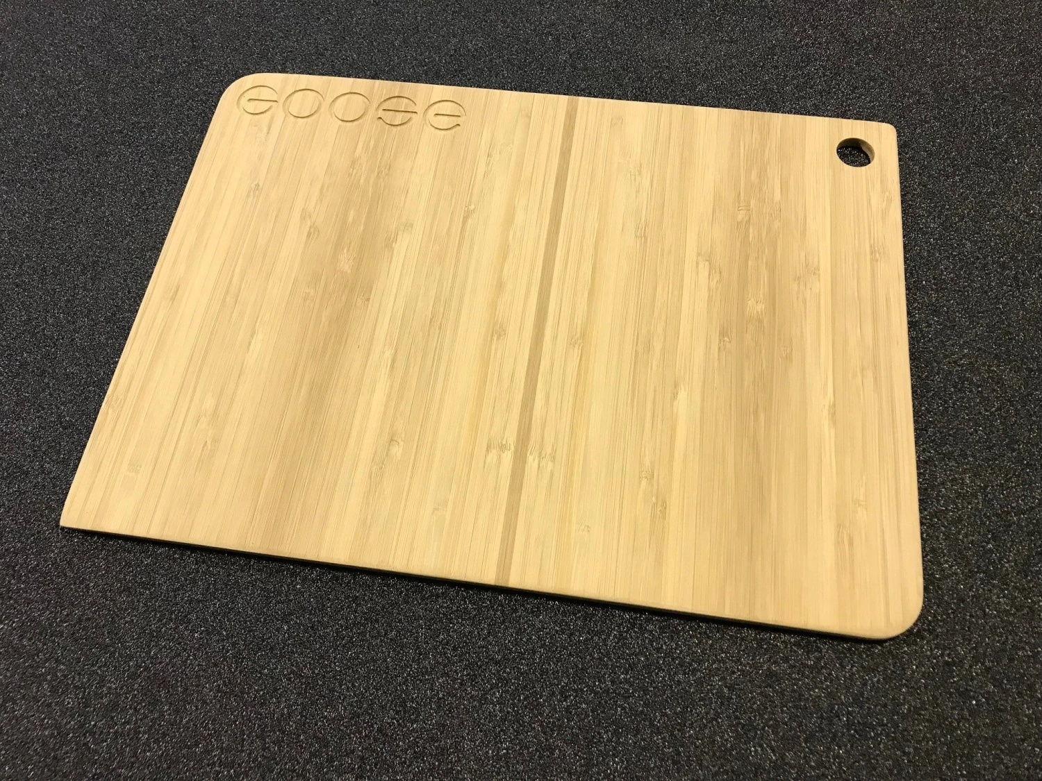 The Goose Gear cutting board is made from 1/4″ thick 3 ply Bamboo. It measures 15″ wide x 11″ long and has a hole cut into it for hanging it out dry while out on the trail.