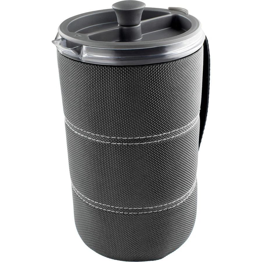 Double-walled, insulated lid and ballistic nylon-wrapped cozy hold in temperature while brewing and serving.