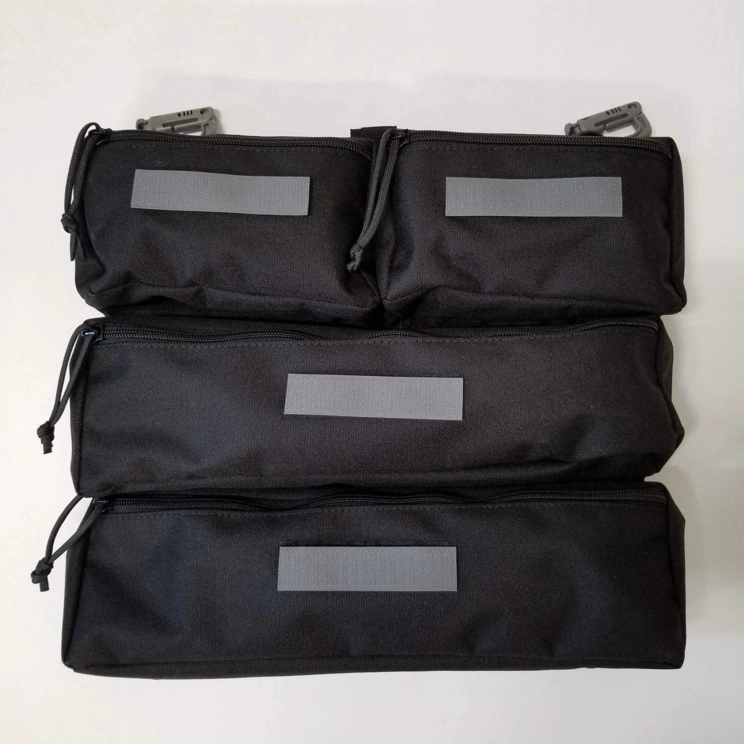 Large sleeve pocket on back panel. Four Each powder coated d-rings for mounting. Handy write-on tabs on pockets (grey not pictured at this time – sorry!)