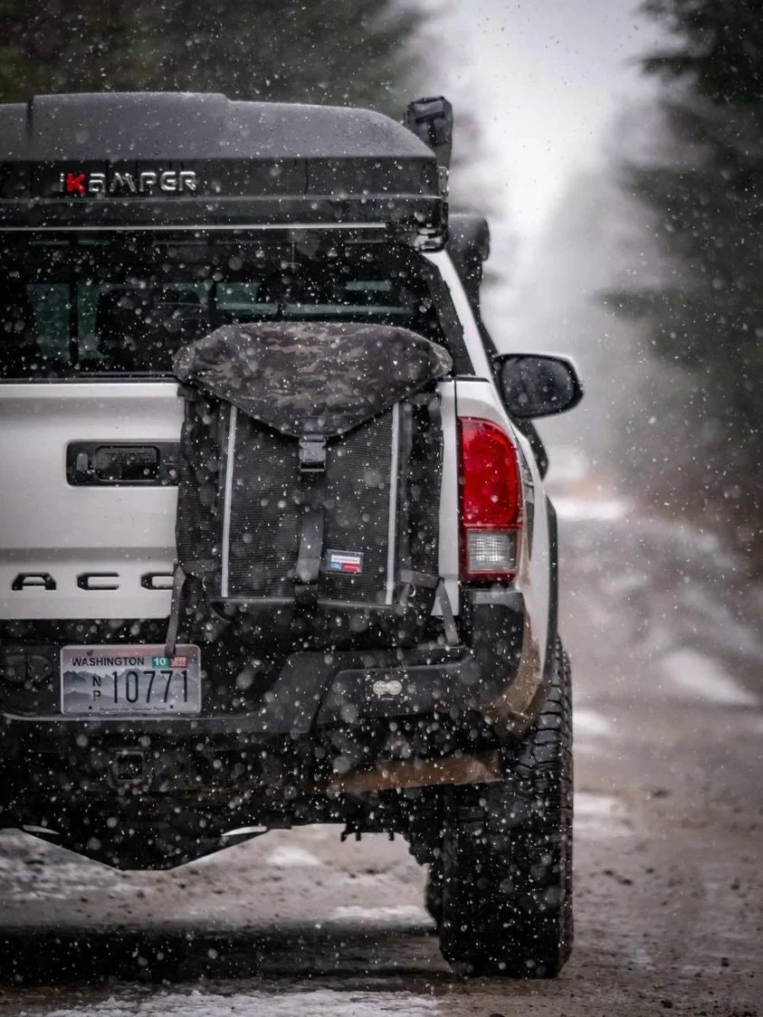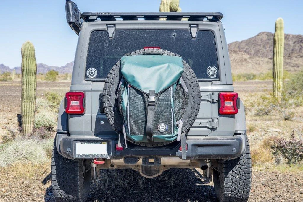 Oscar’s Mobile Hideout is our solution to an all-purpose spare tire/ladder/rack attached utility bag for anything you need on the trail – trash holder, firewood hauler, recovery gear, tool collection, storage, etc. Made of 18oz. poly reinforced vinyl that resists fading and is chemically resistant, as well as highly durable. Get it dirty, hose it out.