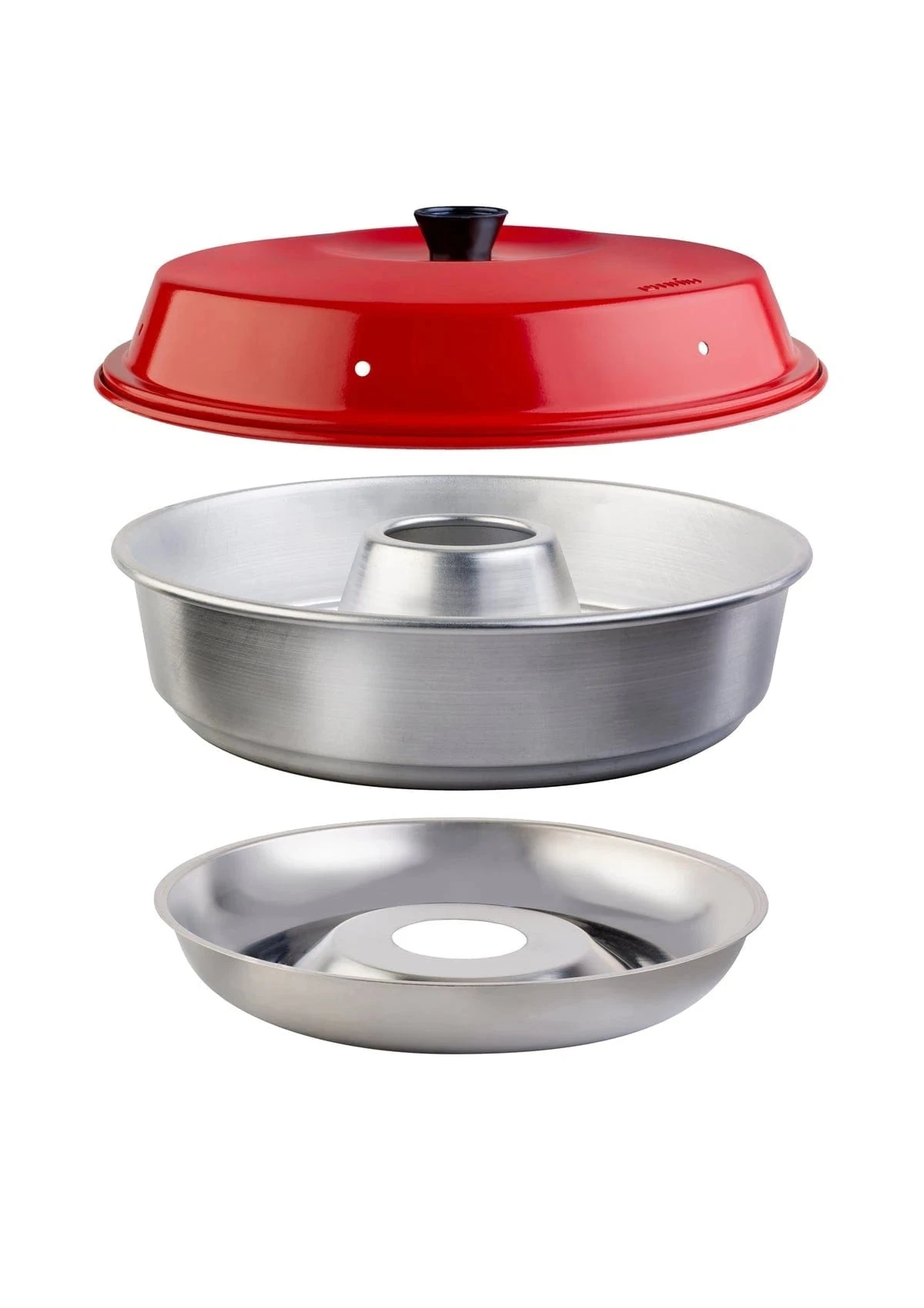 A circular aluminium food container with center hole sits on a matching stainless steel base that is placed over the heat source. The heat spreads along the bottom of the food container and as it rises the specially designed lid with ventilation hole diverts the heat over the top of the container.
