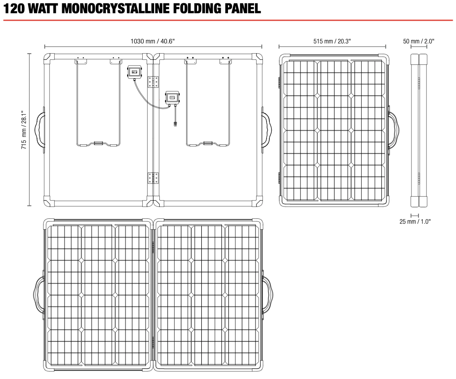 Folding out to 40.6″ × 28.1″ × 1.0″ means that this panel tucks away neatly in the vehicle but opens up to capture an effective amount of sun power to keep you in-charge.