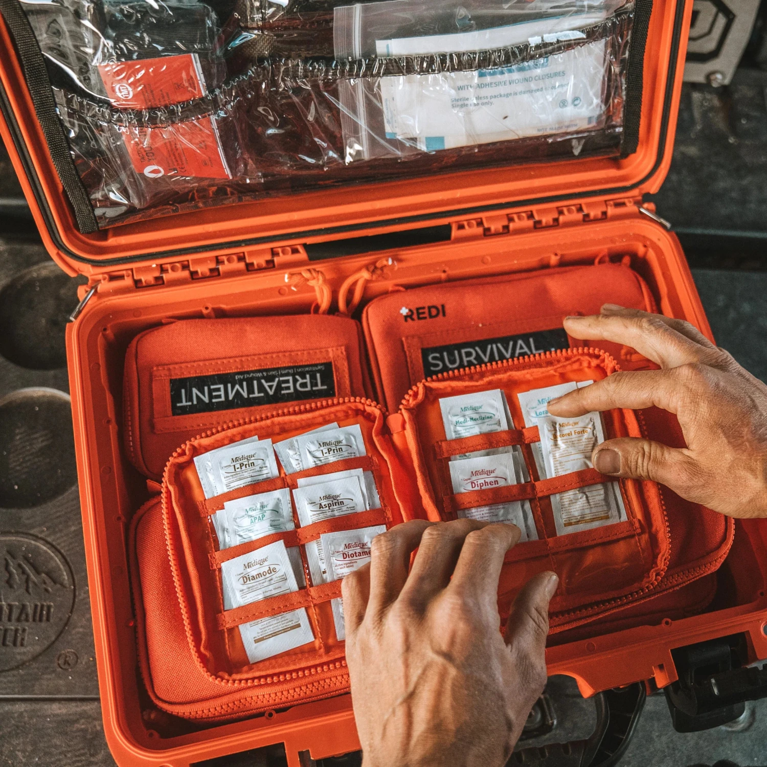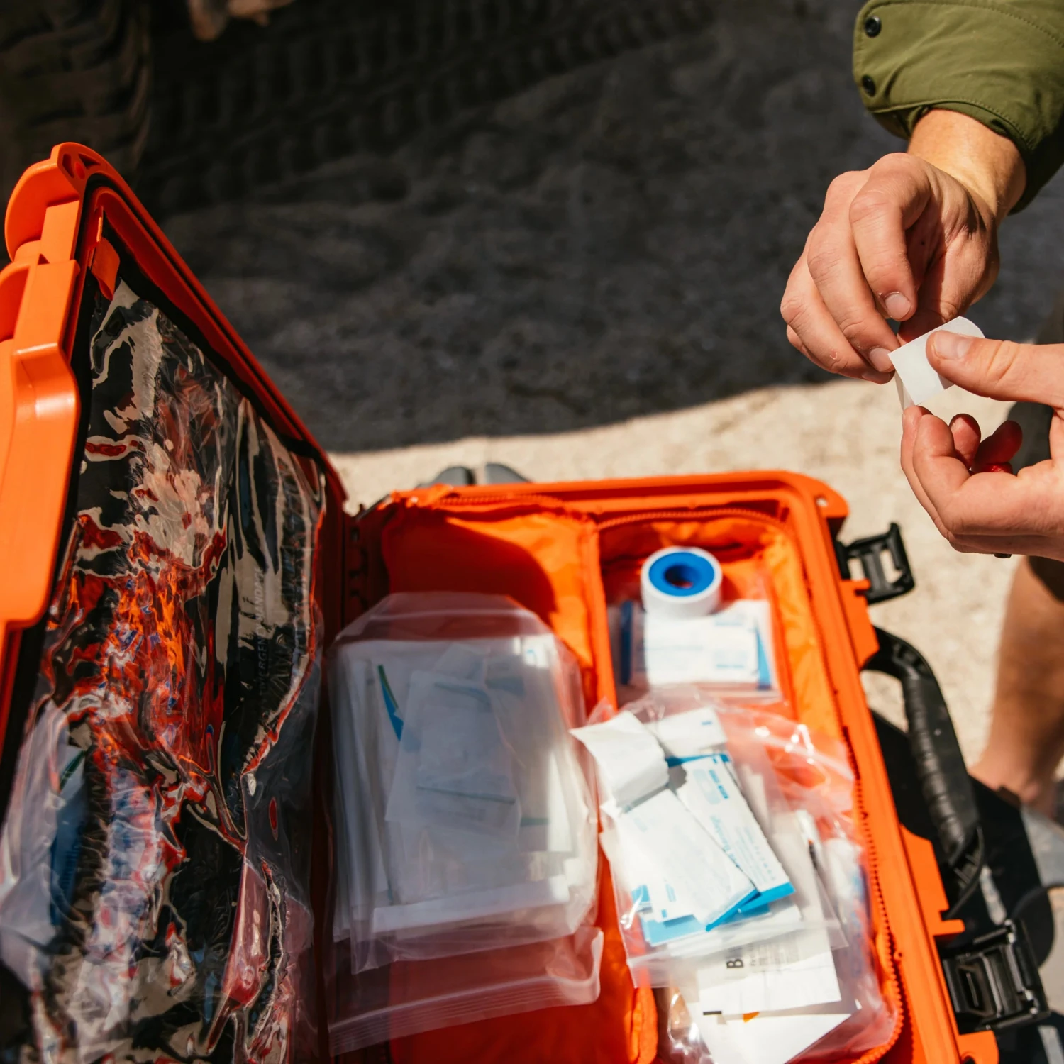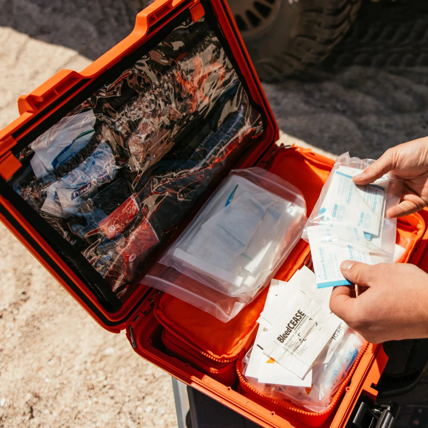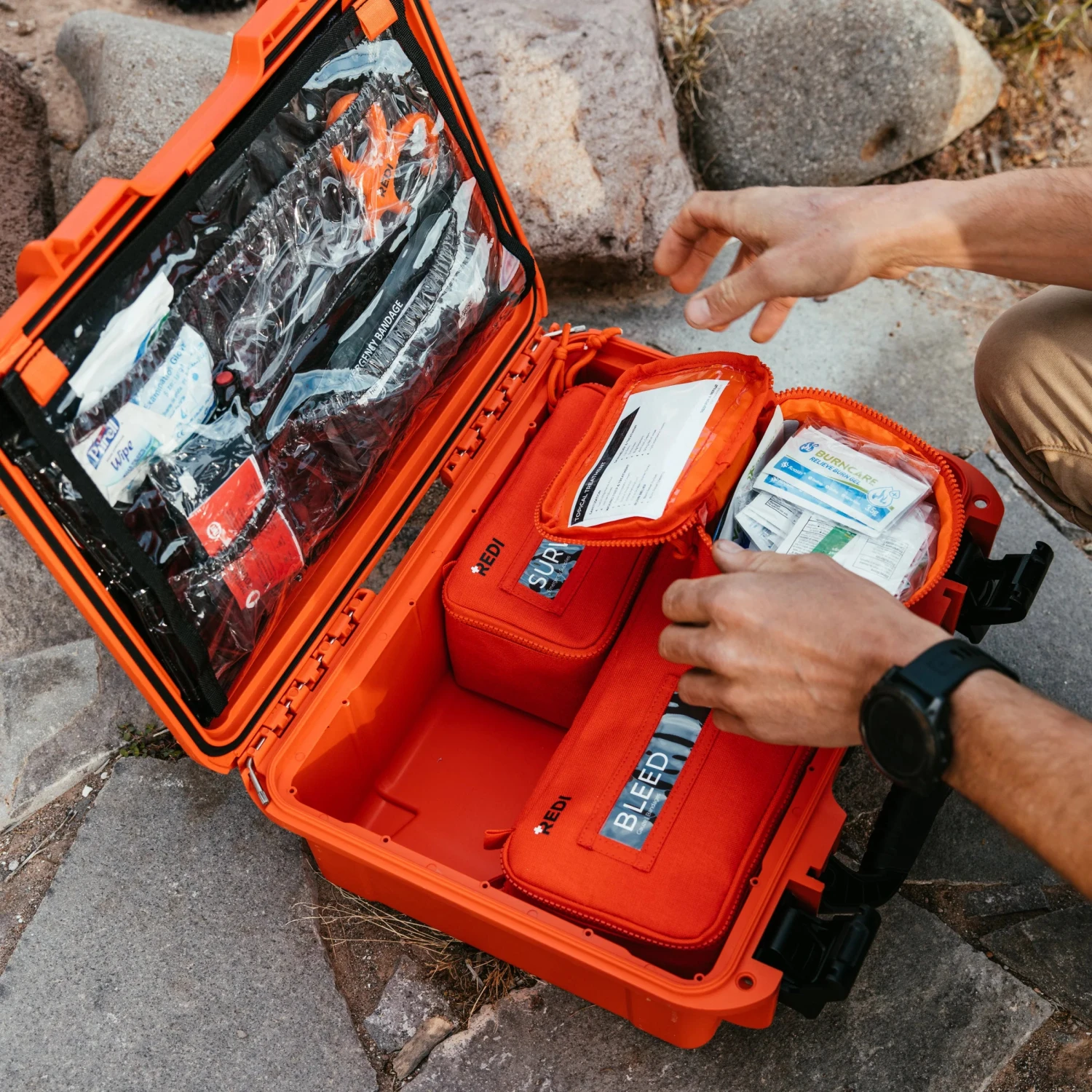 The Pro + includes our Stop the Bleed, trauma supplies, and standard Roadie items in one, extremely durable, organized case. 100% waterproof, shockproof, and can withstand the weight of a car rolling over it.